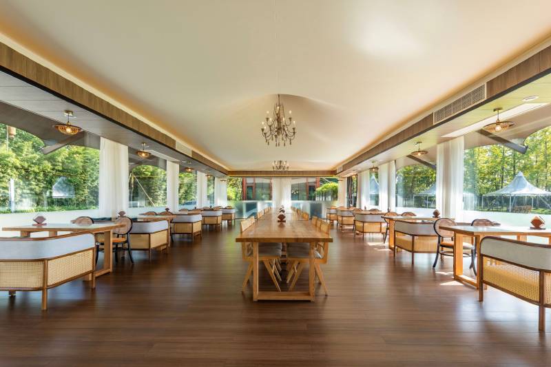 · Luxury interior décor, with fabric-lined ceilings and chandelier options, creates a warm and elegant dining atmosphere.