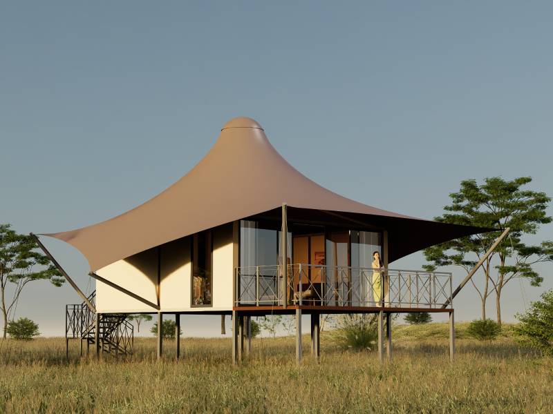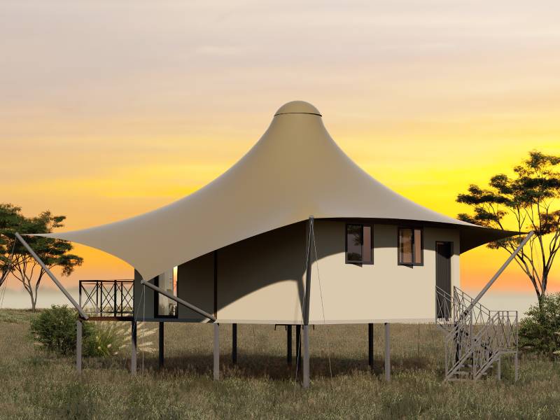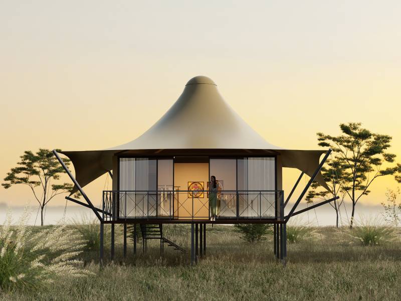 Unlike traditional glamping tents, the LAVISH tent is constructed with a permanent-grade steel frame, PVDF membrane, and tempered glass. It’s designed to remain deployed for 20+ years without degradation.