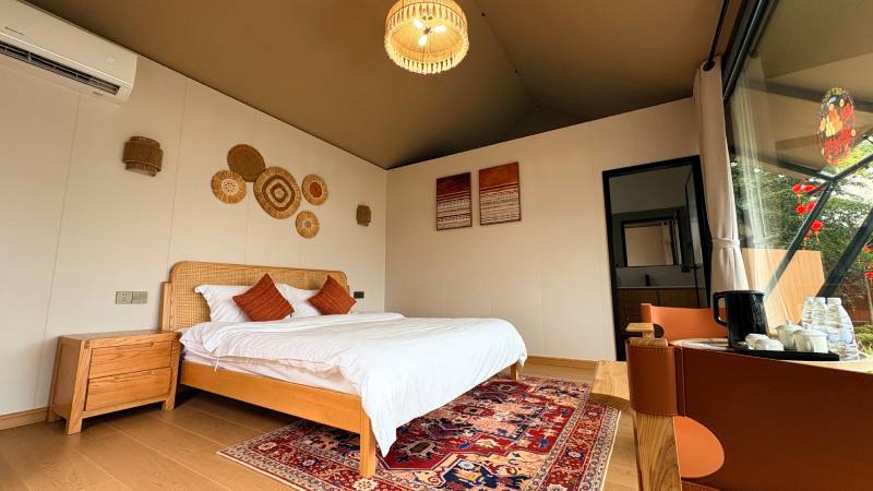 The tent interior is customizable, allowing you to outfit your tent with a bathroom that suits your needs, complete with a washbasin, toilet, and shower, providing the ultimate convenience and luxury during your glamping adventure.